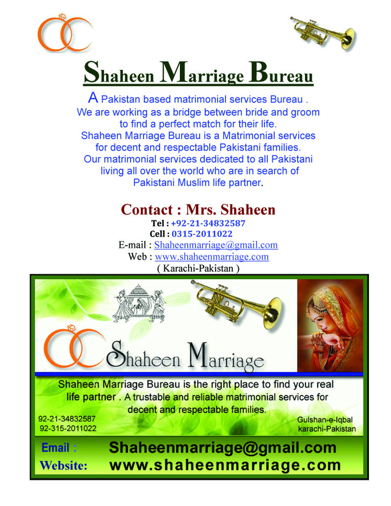 Shaheen Marriage Bureau is a Matrimonial services for Pakistani decent and respectable families. Our matrimonial services dedicated to all pakistani living all over the world who are in search of Pakistani Muslim life partner. We have educated and decent proposals from respectable families. We highly appreciate the families to contact us. Mature sensible individuals are also welcome.